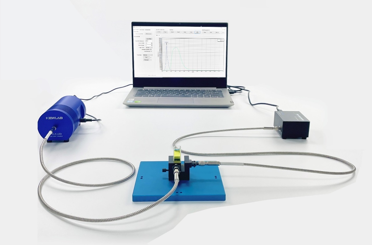 整套設(shè)備由微型光譜儀(含軟件)、激發(fā)光源、比色皿支架和光纖跳線組成。如下圖: