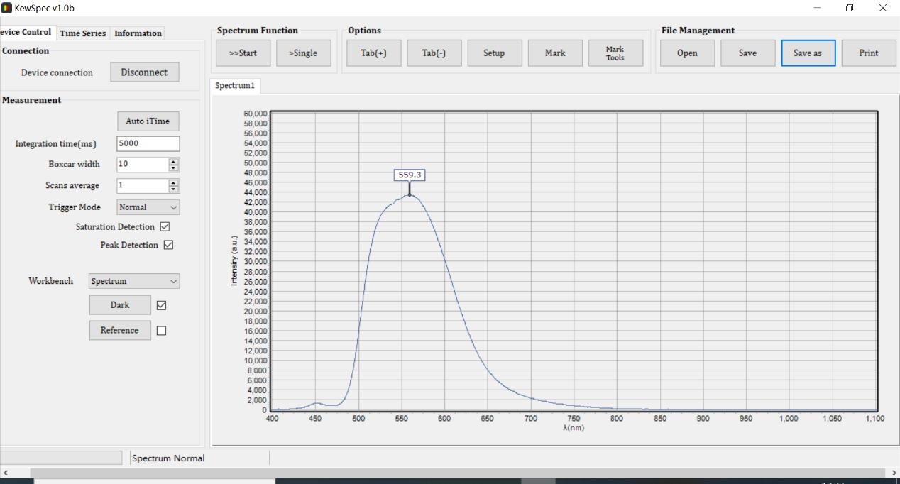 該款微型光譜儀免費(fèi)提供配套光譜測量軟件KewSpec。軟件包含查看、保存、讀取光譜圖和數(shù)據(jù),以及積分時(shí)間、Boxcar平滑和信號(hào)平均等信號(hào)處理等基本功能,還包含光譜測量、吸光度、透過率、反射率等應(yīng)用測量模式。操作界面簡潔明了,易于上手。